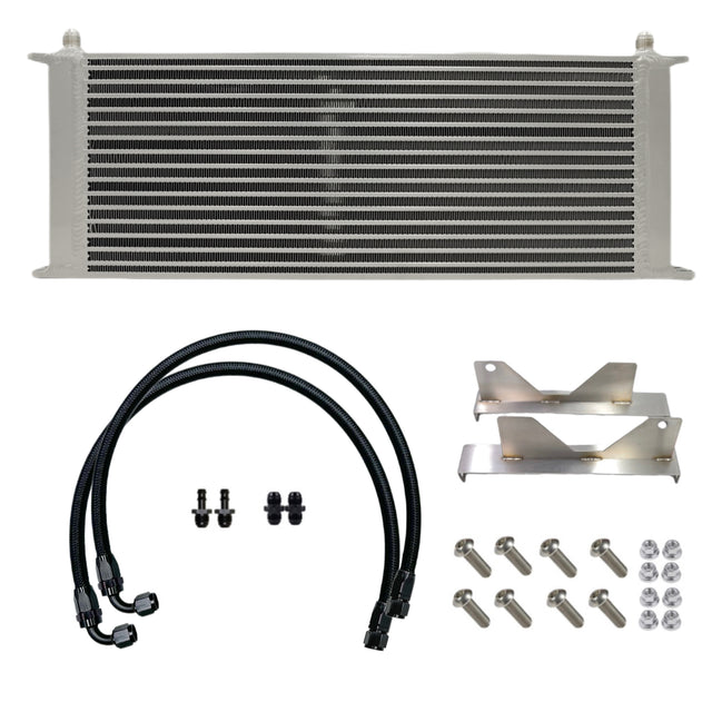 Our kit consists of one MASSIVE oil cooler cores, precision tig welded stainless steel mounting brackets, Stainless Steel allen head screws & flange nuts. To top it off we have an AN braided hose kit to connect to your factory lines or your existing FSD AN braided Transmission line kit. As always, this kit is made in the USA and is backed by FSD's lifetime workmanship warranty.